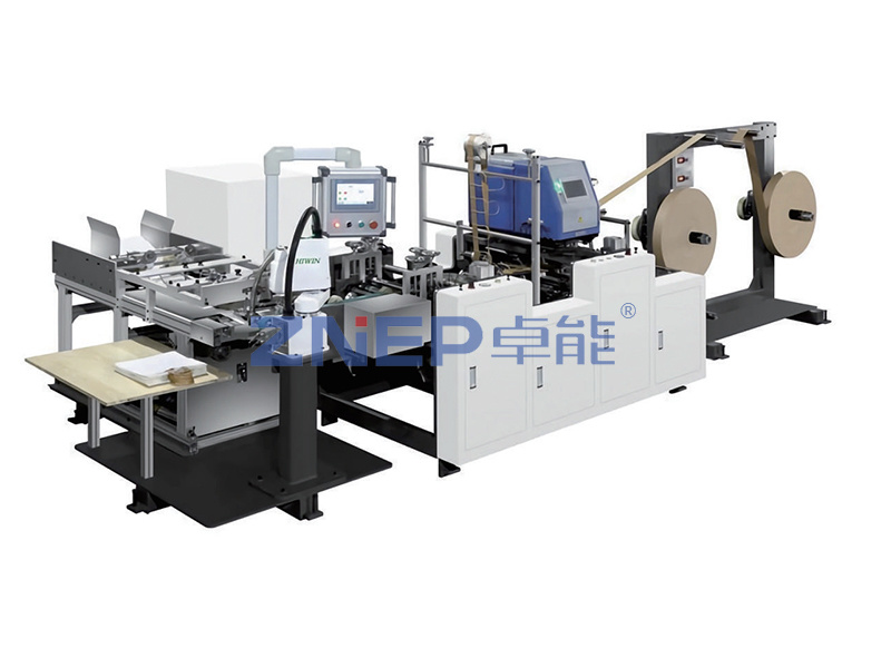 该机器用于生产带手挽加舌口的手提纸袋,由手挽工位将制好的圆绳和卷筒纸片自动做成手挽。通过输送系统将做好的手挽传送给切把、送把贴把、压把的工位,然后将原色或印刷好的卷筒纸进行舌口的开窗吸废、涂胶贴纸、易撕线预刺、舌口位预刺、贴片避绳位点断、贴片位涂胶、自动粘贴手挽,再由主机将贴有手挽的纸张进行涂边胶、成筒、拉断、切断、压痕、底部涂胶、袋底成形并输送出袋,整个过程一次性同步完成。真正实现了全自动化生产,能够有效地节省人工成本。