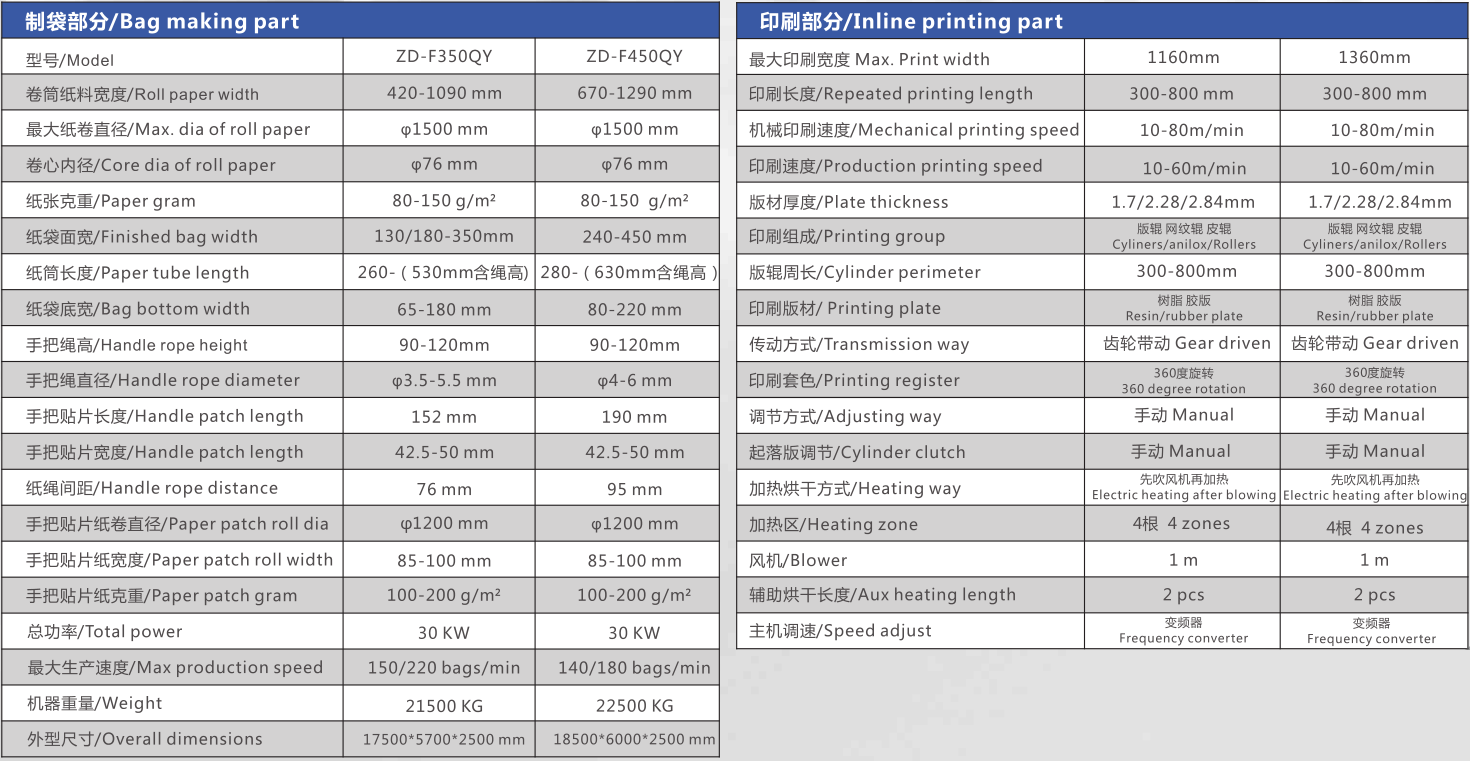 该机器用于生产带手挽的手提纸袋,并配有4色同步印刷,由手挽机将卷绳和贴片卷筒纸制成手挽,通过输送系统将手挽送至贴把机组然后将原色或印刷好的卷筒纸进行贴片位点断、贴片位涂胶、自动粘贴手挽,再由主机将贴有手挽的纸张进行涂边胶、成筒、切断、压痕、底部涂胶、袋底成形并输送出袋,整个过程一次性同步完成。此设备真正实现了全自动化生产,能够有效地节省人工成本。
