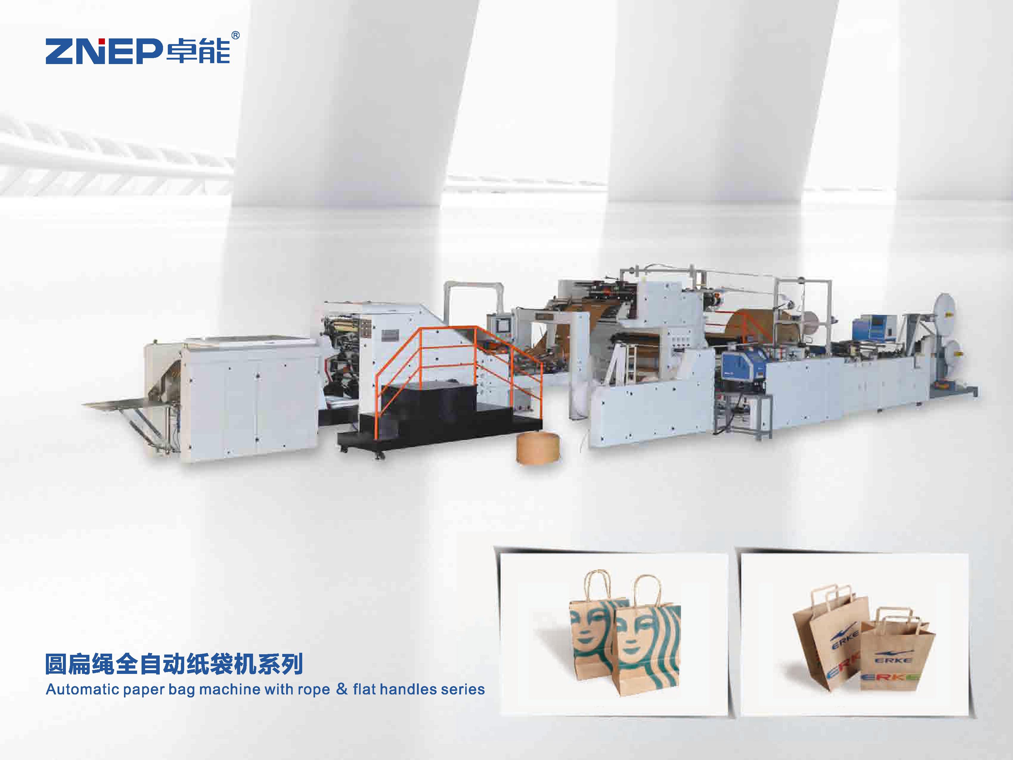该机器用于生产带手挽的手提纸袋,由手挽工位将制好的圆绳和卷筒纸片自动做成手挽,通过输送系统将做好的手挽传送给切把、送把、贴把、压把的工位,然后将原色或印刷好的 卷筒纸进行贴片位点断、贴片位涂胶、自动粘贴手挽,再由主机将贴有手挽的纸张进行涂边胶、成筒、切断、压痕、底部涂胶、袋底成形并输送出袋,整个过程一次性同步完成。真正实现 了全自动化生产,能够有效地节省人工成本。