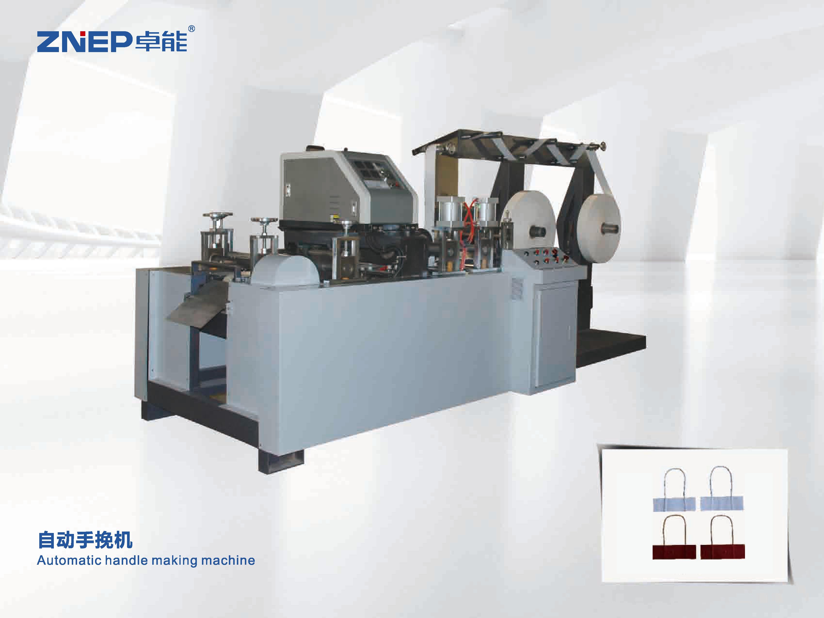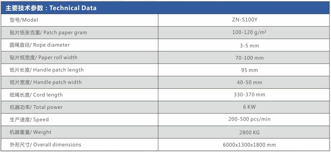 本机用于高速生产圆绳手把,后期可通过人工将手把黏贴到纸袋上,使之变为手提购物纸袋。该机器以两卷窄幅卷筒纸和一卷纸绳为原料,通过将卷筒纸片和纸绳黏 贴在一起并逐步切断,从而形成手把,此外该机器也有自动计数和自动上胶的功能,能极大地提高用户后续加工作业的效率。